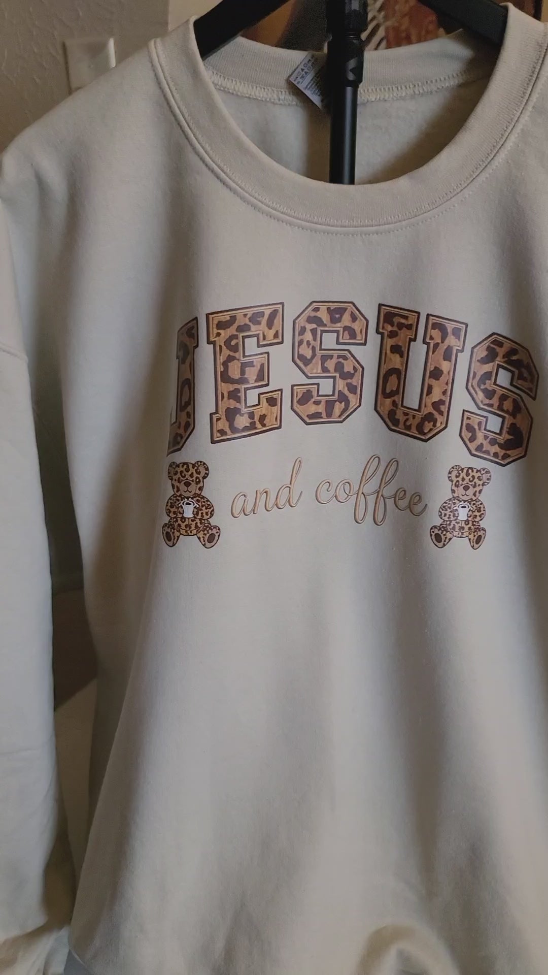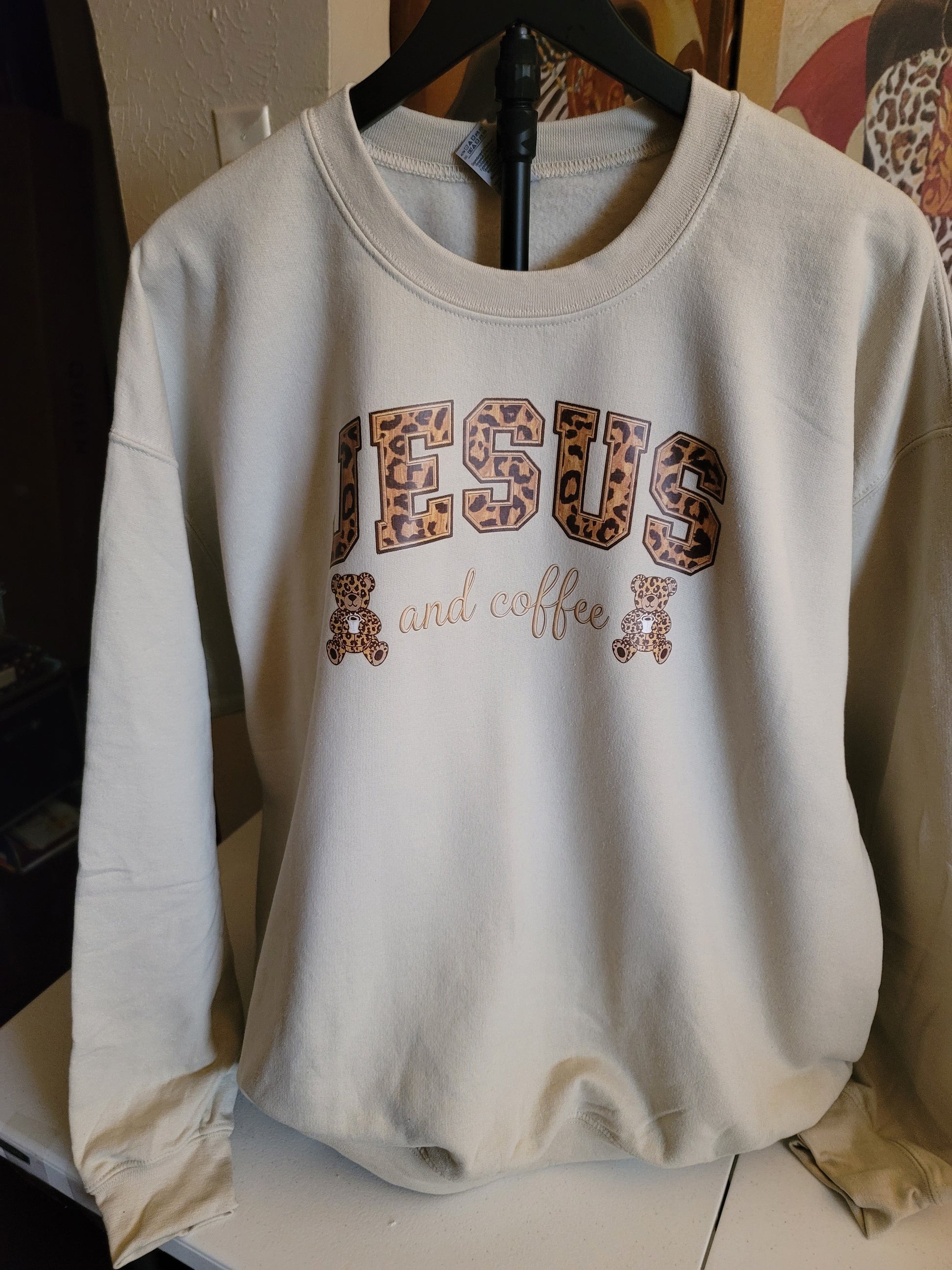 Full color digital screen print. Pressed on Sand Gildan sweatshirt.